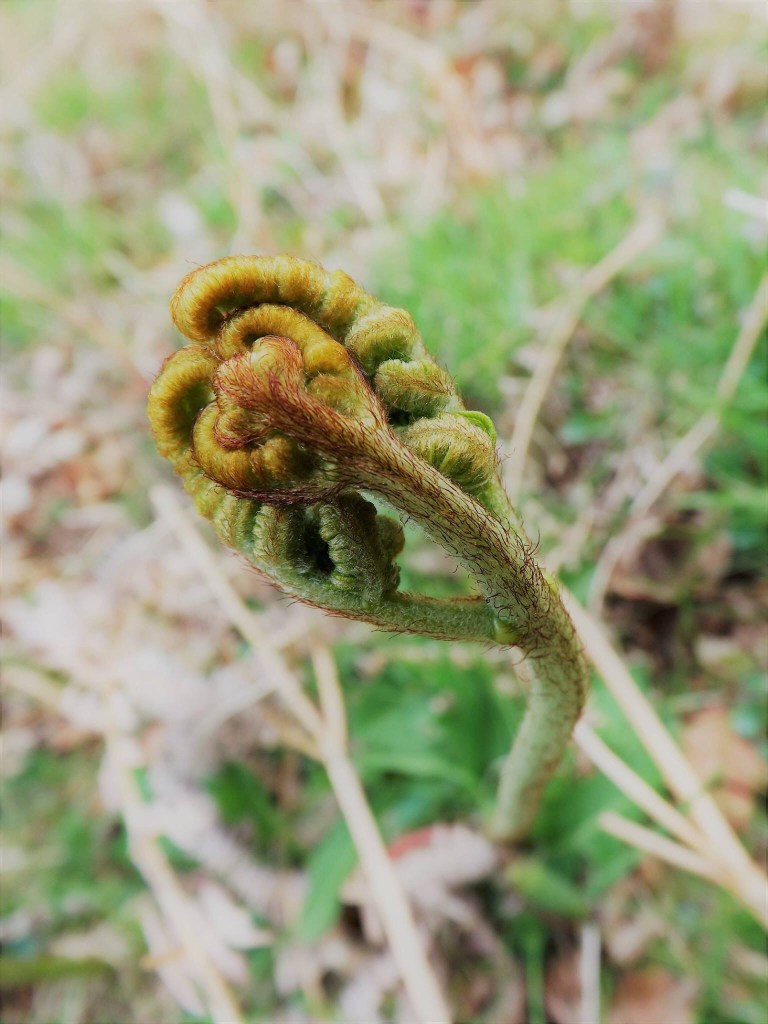 Ferns, just starting to stretch their curling limbs, are just visible above the ground, shaped like hairy hearts they are everywhere.Wild yellow primroses peek through winding roots of trees which cling onto the banks, trying not to slip and fall into the stream. The ground seems to be covered in sticks and wood which have been broken off in the recent stormy weather.