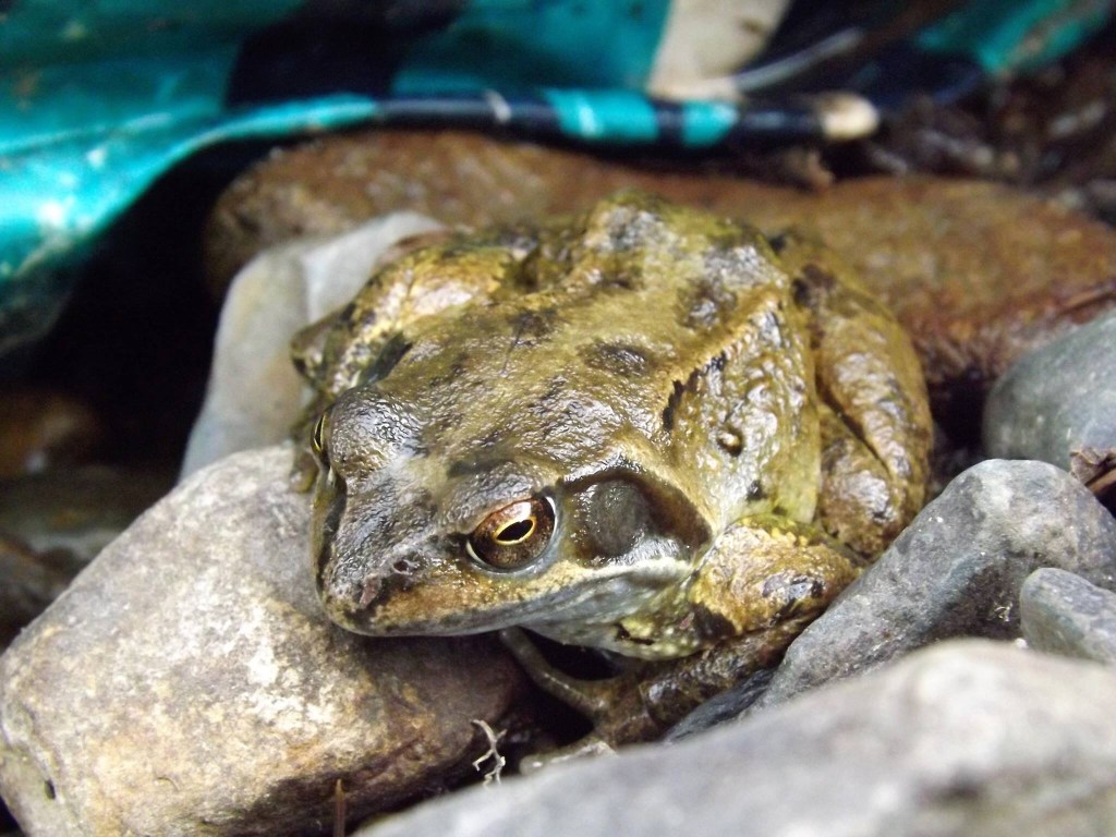 The stream flows over fallen trees, rotten branches, leaf mould and mossy declines. A mottled moss green and khaki toned frog pokes his head out from under a piece of bright blue tarpaulin that has set sail further up the hill and has become entangled and trapped amongst the debris lining the stream bed.