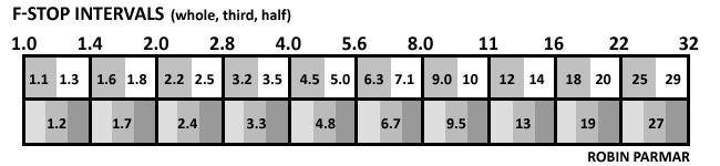 You can also use Aperture priority to find the ‘sweet spot’ of your lens. If you set the camera to A mode and put it on a tripod, start with the widest aperture and take a series of photos of the same object at each different aperture setting. This will give you a chance to see how the look of the photo changes but once you upload the photos to your computer and zoom in on them you will also find the aperture at which your camera takes the sharpest photos. Whilst the highest apertures might keep everything from front to back in focus you will probably find that, for overall sharpness, you are looking at a midrange aperture. This is the ‘sweet spot’ of your lens which is usually in the mid range. Knowing this information is useful to keep in mind when you want to take a photo that will give you the maximum possible sharpness when shooting in natural light. The rule of thumb is that it is 2 F/stops up from the widest lens aperture. As lenses can have apertures that are 1/3rd or 1⁄2 of an F-stop I have included a chart of full F-stop values below.